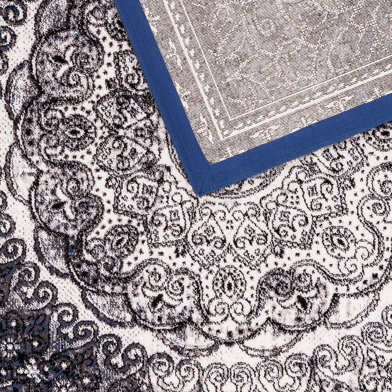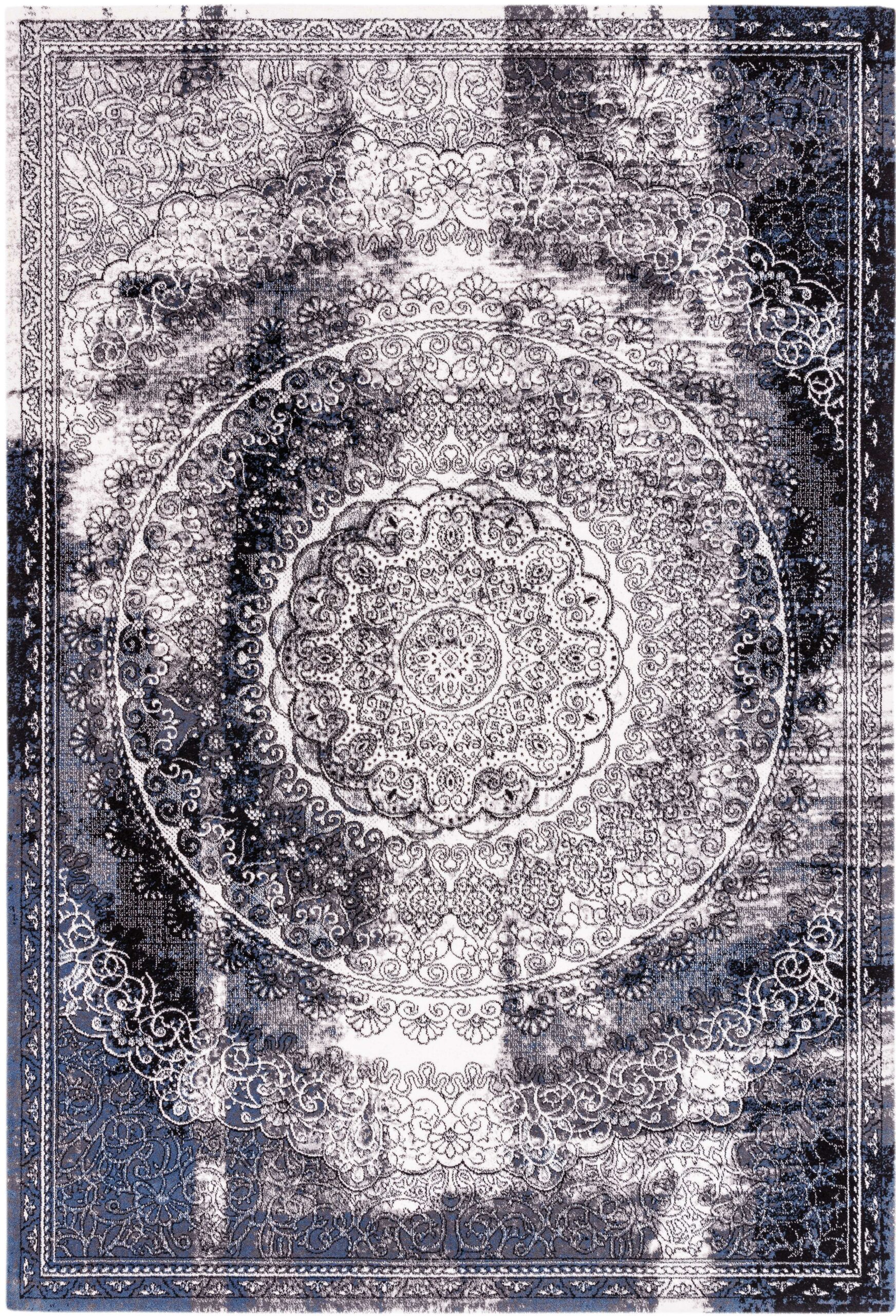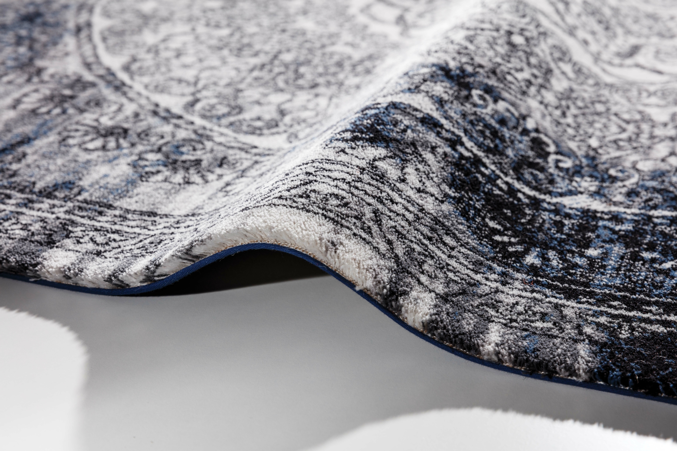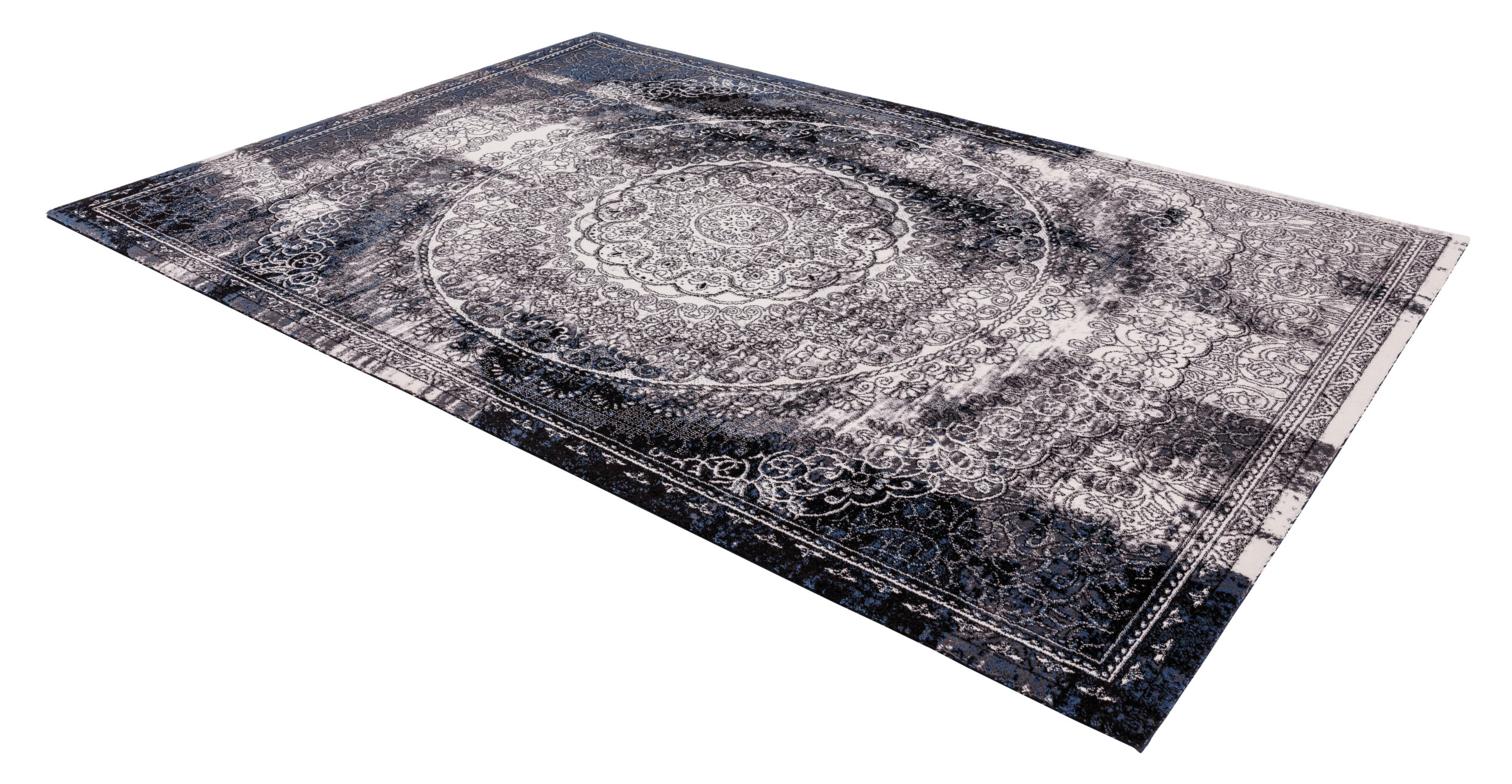 Dywan Currus czarny to połączenie tradycji z nowoczesnością. Niezwykle precyzyjnie opracowany ornament przywodzący na myśl zwiewne wzory koronek został wzbogacony przez efektowne przetarcia. Wyjątkowo oryginalna i odważna kolorystyka to połączenie czerni, granatu, dwóch odcieni szarości i bieli. Dywan będzie wspaniałym dodatkiem do wnętrz nowoczesnych, jak również wnętrz utrzymanych w bardziej tradycyjnym stylu.